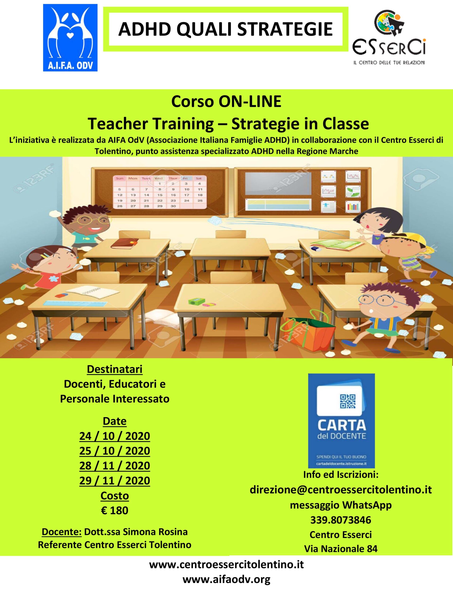 TOLENTINO (MC). “ADHD a scuola, quali strategie”, al via in ottobre il corso online di Teacher Training, strategie in classe, per l’ADHD rivolto a docenti, educatori e personale scolastico interessato, realizzato da AIFA Odv, Associazione Italiana Famiglie ADHD, in collaborazione con il Centro Esserci di Tolentino, punto assistenza specializzato ADHD nelle Marche. La partecipazione è aperta a tutti gli interessati, chi ne è in possesso può utilizzare la Carta del Docente. Il corso è incluso nella piattaforma Sofia dell’Ufficio Scolastico Regionale delle Marche.
