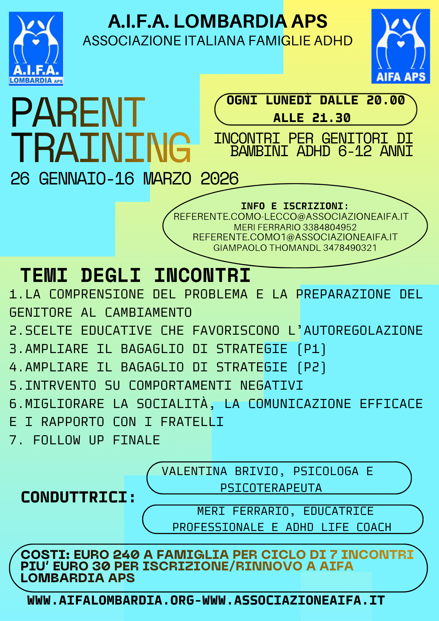 Il ciclo di Parent Training è riservato ai soci in regola con l’iscrizione o il rinnovo ad AIFA APS o AIFA Lombardia APS.