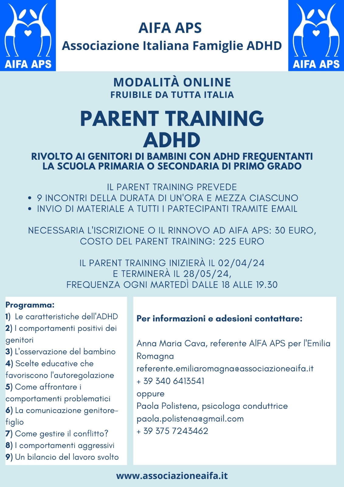 A tutti i partecipanti verrà inviato il materiale tramite e-mail. È necessaria l’iscrizione, o il rinnovo, ad AIFA APS (€ 30,00). Il costo del Parent Training ammonta a € 225,00.