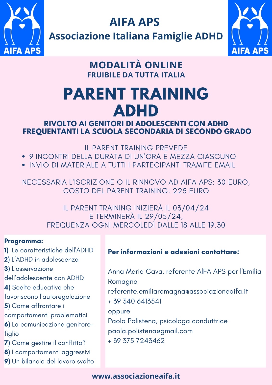A tutti i partecipanti verrà inviato il materiale tramite e-mail. È necessaria l’iscrizione, o il rinnovo, ad AIFA APS (€ 30,00). Il costo del Parent Training ammonta a € 225,00.