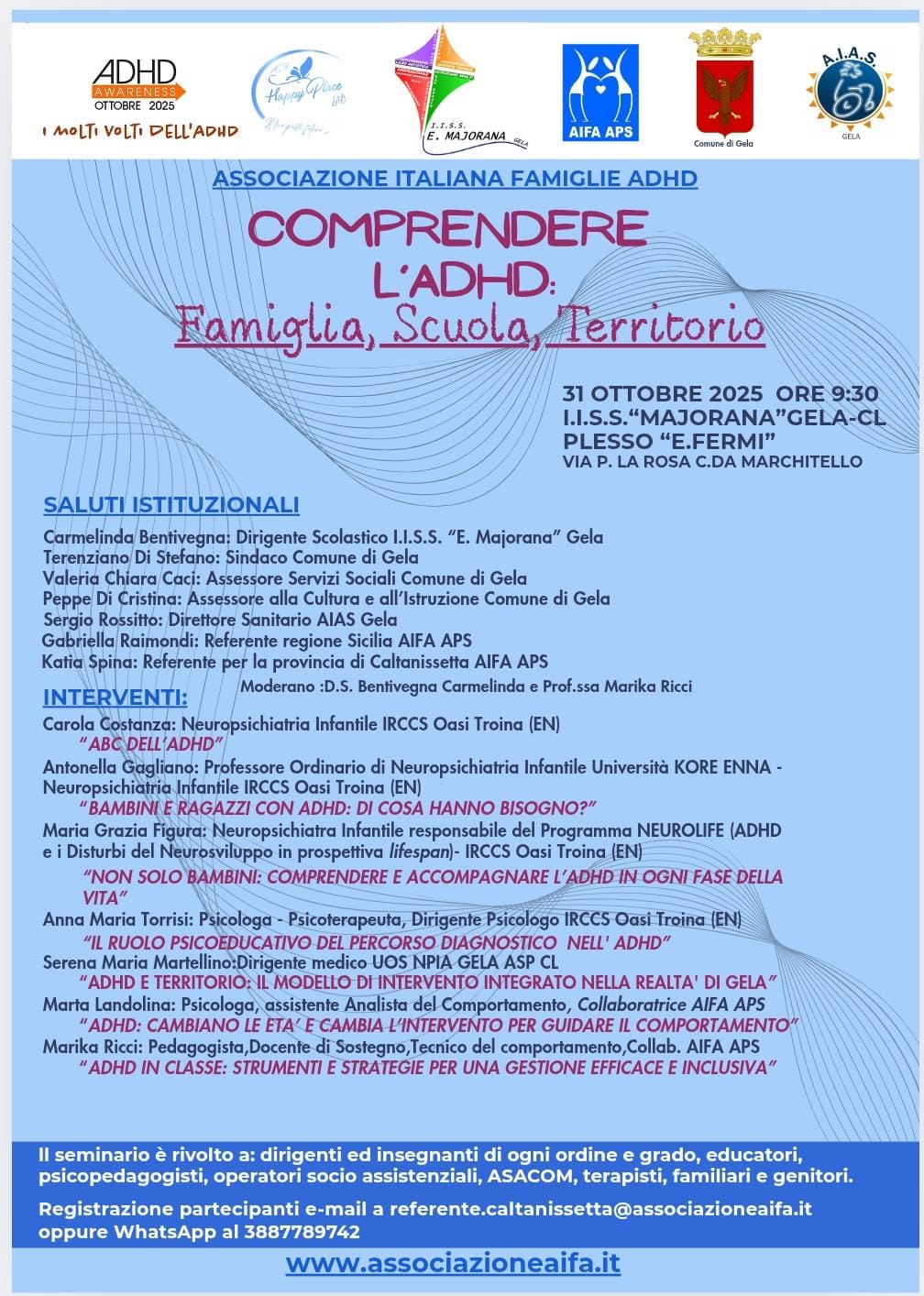 GELA (CL). Venerdì 31 ottobre 2025. “Comprendere l’ADHD: Famiglia, Scuola, Territorio” è il seminario organizzato da AIFA APS, Associazione Italiana Famiglie ADHD, presso l’ISS “Ettore Majorana”, plesso “Enrico Fermi” in via P. La Rosa contrada Marchitello, a Gela in provincia di Caltanissetta, con inizio alle ore 09.30.