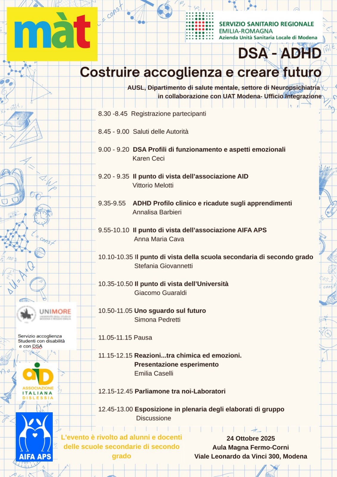 Modena, venerdì 24/10/2025 – In occasione della XV Edizione del MAT, Settimana della Salute Mentale di Modena, e nel mese della consapevolezza ADHD, l’associazione AIFA APS partecipa all’incontro “DSA e ADHD, costruire accoglienza e creare futuro”, ore 8.30-13.00 presso l’Aula Magna ITS Fermo-Corni, viale Leonardo da Vinci 300, Modena.