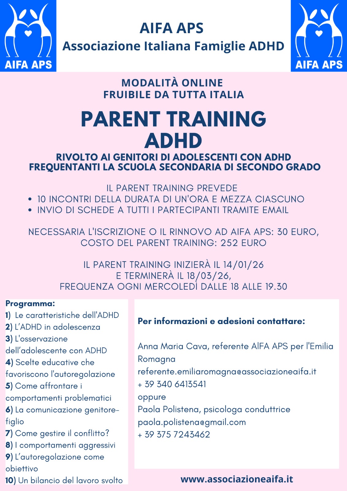 AIFA APS – Associazione Italiana Famiglie ADHD – organizza una nuova edizione di Parent Training online, rivolto ai genitori di adolescenti con ADHD frequentanti la scuola secondaria di secondo grado (14 – 18 anni).