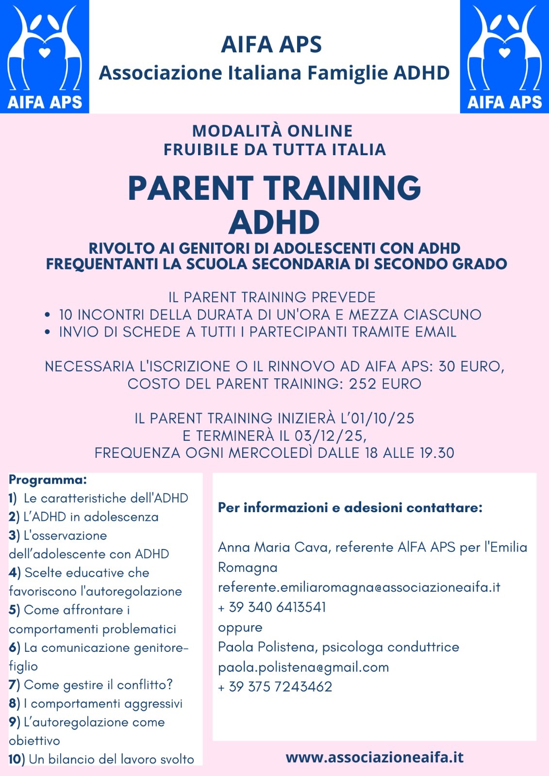 A tutti i partecipanti verrà inviato il materiale tramite e-mail. È necessaria l’iscrizione, o il rinnovo, ad AIFA APS (€ 30,00). Il costo del Parent Training ammonta a € 252,00.
