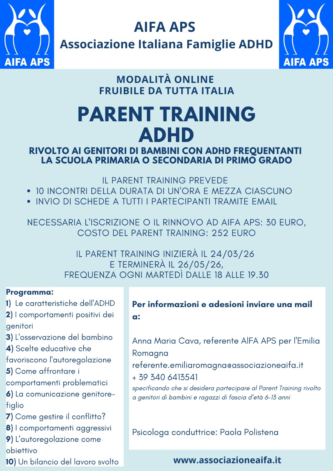AIFA APS – Associazione Italiana Famiglie ADHD – organizza una nuova edizione di Parent Training online, rivolto ai genitori di bambini con ADHD frequentanti la scuola primaria o secondaria di primo grado (6-13 anni).