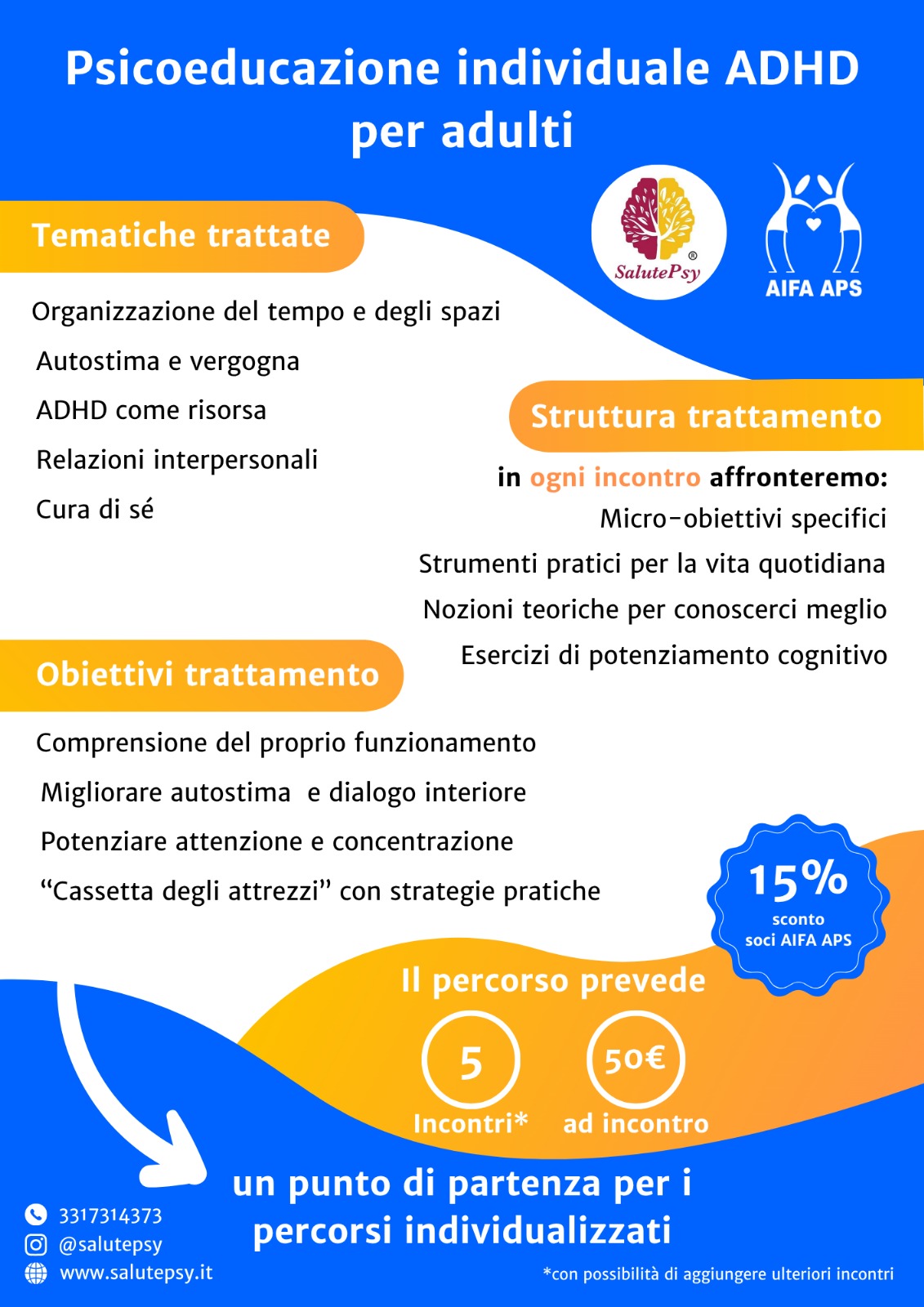 Psicoeducazione individuale per adulti con ADHD. L’associazione AIFA APS organizza in collaborazione con SalutePsy – Centro di Psicologia e Psicoterapia Cognitivo Comportamentale (www.salutepsy.it), 5 incontri individuali dedicati a persone dai 18 anni in su con diagnosi di ADHD, per comprendere meglio l’ADHD, migliorare la propria autostima e potenziare attenzione e concentrazione.