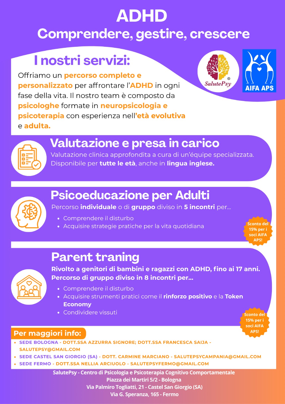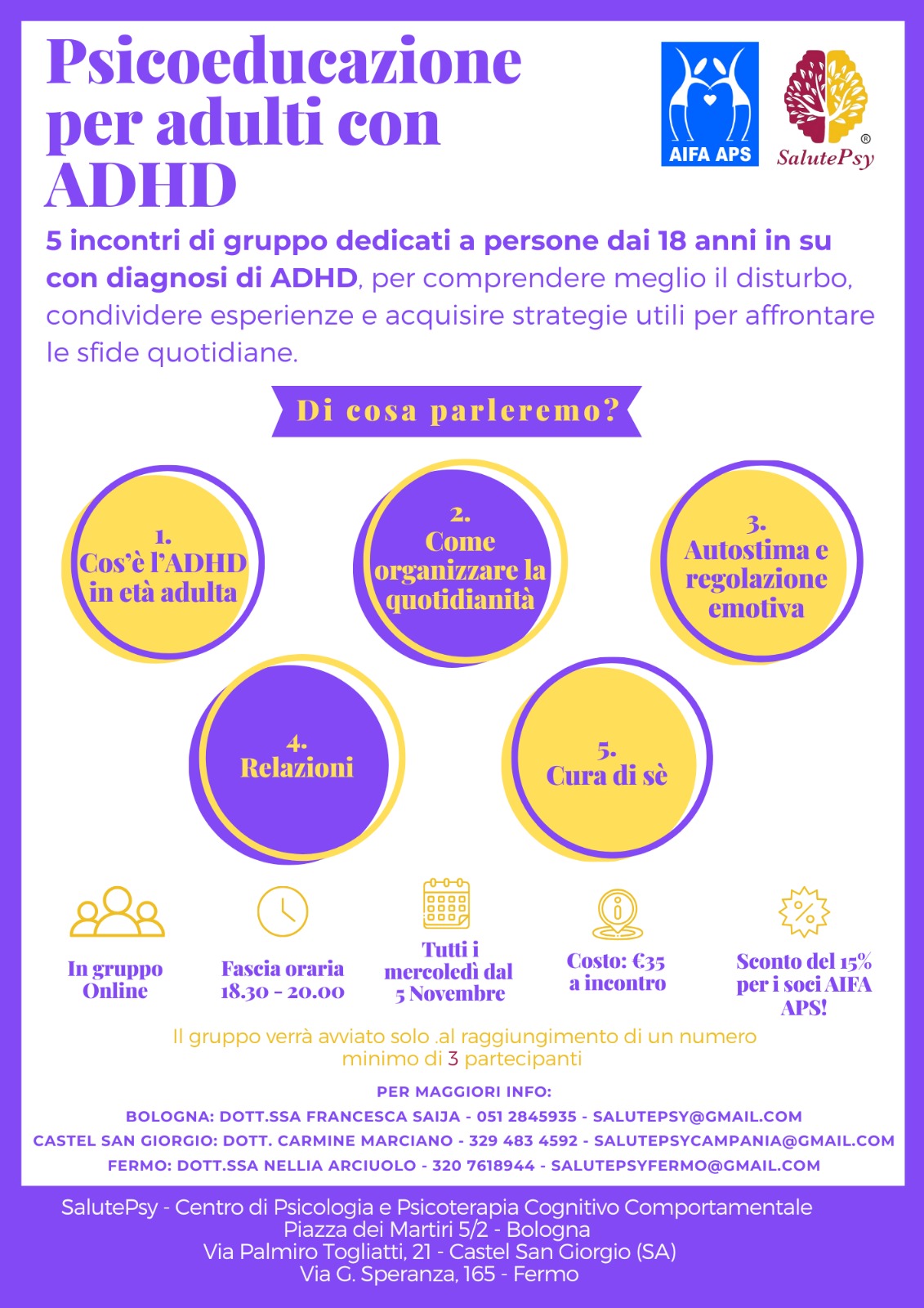 Psicoeducazione per adulti con ADHD. L’associazione AIFA APS organizza in collaborazione con SalutePsy – Centro di Psicologia e Psicoterapia Cognitivo Comportamentale (www.salutepsy.it), 5 incontri di gruppo dedicati a persone dai 18 anni in su con diagnosi di ADHD, per comprendere meglio l’ADHD, condividere esperienze e acquisire strategie utili per affrontare le sfide quotidiane.