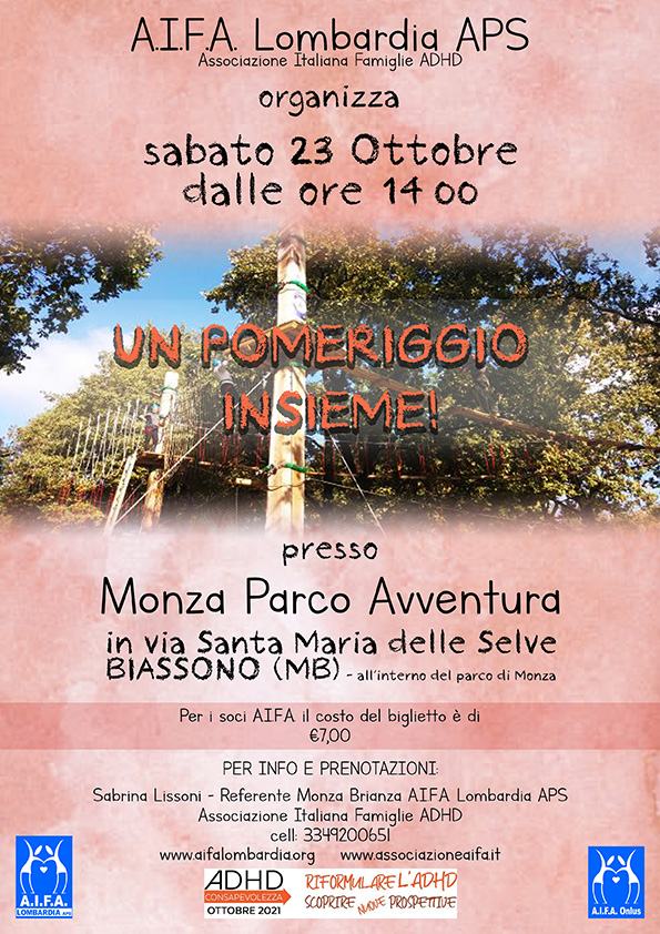 MONZA. “Un pomeriggio insieme!” – sabato 23 ottobre 2021 alle ore 14.00 AIFA Lombardia APS – Associazione Italiana Famiglie ADHD, ripropone l’uscita al Parco Avventura all’interno del Parco di Monza che era stata annullata in settembre a causa del maltempo.